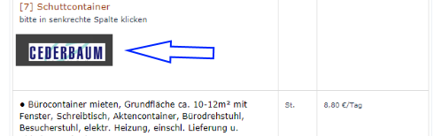 Unternehmen/Handwerksbetriebe/freie Berufe haben die Möglichkeit Ihr Werbebanner in Ihrem Gewerk direkt neben den jeweiligen Preispositionen zu platzieren. Hierfür kommt Bannergrösse "BETA" zum Einsatz; 174x53px/4,61x1,40cm. Das Banner wird mit Ihrer Homepage verknüpft (verlinkt)und Sie erhalten einen passwortgeschützten Zugang zum Kundencenter für die Anzeige der Besucherstatistik.